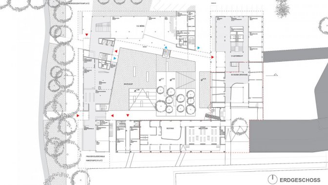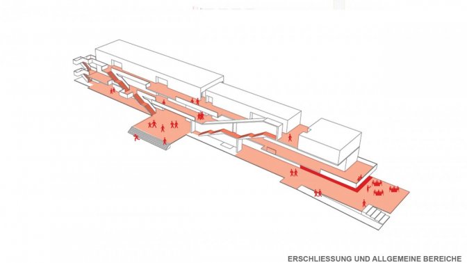 Das Erweiterungsgebäude an der Akademiestraße bildet einen öffentlichen Sockel mit allen Funktionen, die Austausch und Kommunikation fördern. Mensa, Mehrzweckraum, Hörsäle und Bibliothek sind im Einklang mit den Passagen und dem Hof die Bereiche, die diese Interaktion ermöglichen. Die Architektur entwickelt sich dann in eigenen Einheiten zwischen den Passagen, die immer wieder offene Zonen mit Ausblick nach Außen bilden. Diese Ausblicke suchen auch Anregungen in der nahen und weiten Landschaft, um die Aufenthaltsqualität dieser Bereiche zu stärken.Die gewählte Typologie für den Riegel an der Viktor-Keldorfer-Straße ist die eines Fassadenraumes als Erschließungs- und Kommunikationszone. Infolgedessen ist dieser Raum der Ort der Bewegung und der Stationen, welcher die verschiedenen Ebenen verbindet.