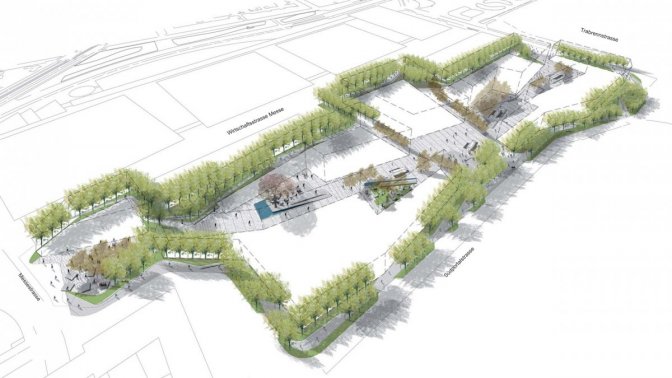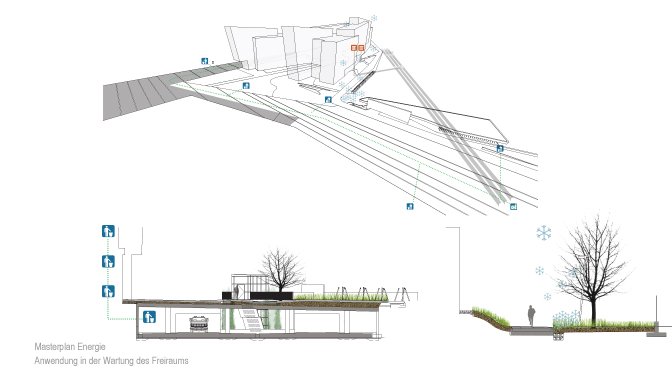 Zudem spielt die Ausschilderung der unterschiedlichen Wege eine maßgebende Rolle bei der Artikulierung der verschiedenen Ströme, insbesondere für Nutzer mit Sehschwäche. So wurden auf dem ganzen Campus Blindenleitsysteme für den Boden geplant und gebaut, sowie auch Touch-Infografiken mit Hinweisen in Blindenschrift, wodurch diejenigen, die es benötigen, die Ströme und Wege finden und ihnen auch folgen können.