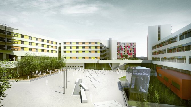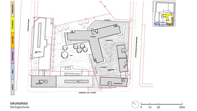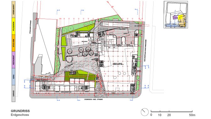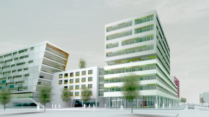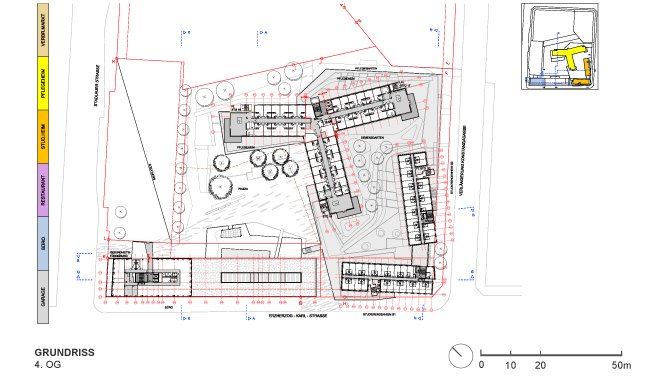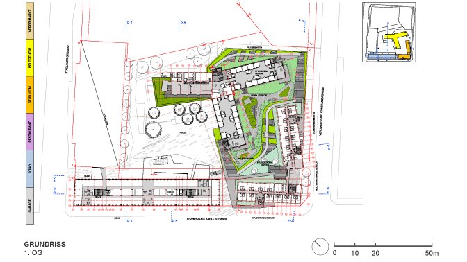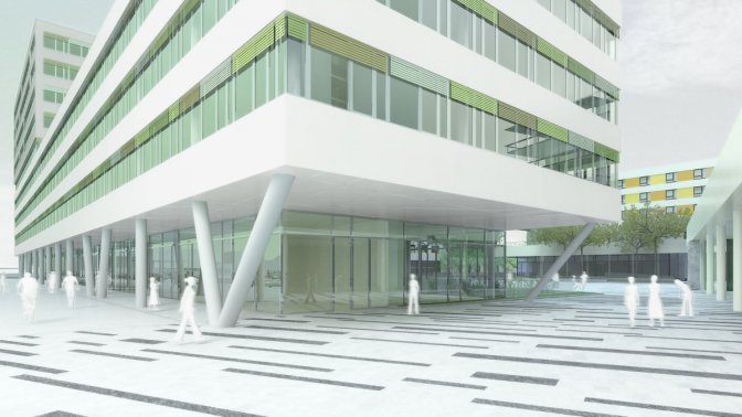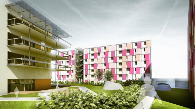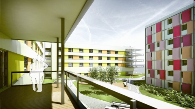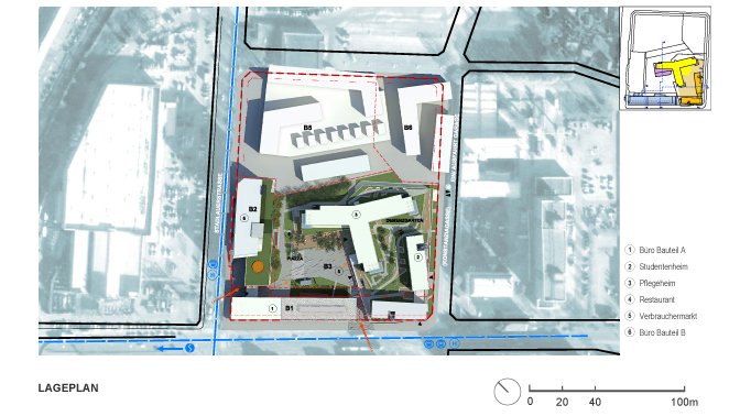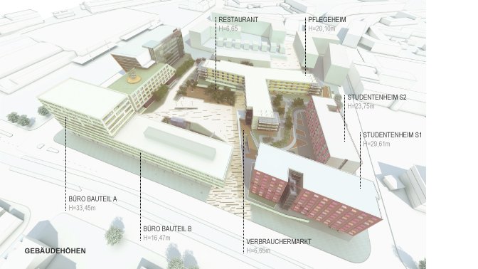 Als städtebaulicher Schwerpunkt und Erkennungszeichen des Planungsgebietes werden am stadteinwärts gelegen Eckbereich des Grundstückes zwei hohe Baukörper (Bauteil A und B) situiert. Die Baukörper sind voneinander abgesetzt, um durch die geöffnete Ecke den Stadtraum und die inneren Freiflächen des Areals über einen vermittelnden Vorplatz zu verbinden. Eine Passage in Nord-Südrichtung sorgt für die fußläufige Durchlässigkeit der Anlage. Bauteil A bildet entlang der Erzherzog-Karl Straße einen Riegel, der die Schall- und Abgasemissionen der Hauptverkehrsstraße vom mittig am Grundstück gelegenen Altenheim abschirmt. Die Höhenentwicklung des Riegels nimmt stadtauswärts ab und erzeugt damit einen Dialog mit der Bebauung am östlich gelegenen Grundstücksrand, die als urbane Platte ausgebildet ist, in deren Sockel ein Verbrauchermarkt untergebracht wird und auf der ein Studentenheim in zwei freistehenden Baukörpern aufgesetzt ist. Durch die unterschiedliche Charakteristik der Ecksituationen des Blocks nimmt die Bebauung einen differenzierten Bezug zum Stadtkontext des Viertels Stadlau auf.